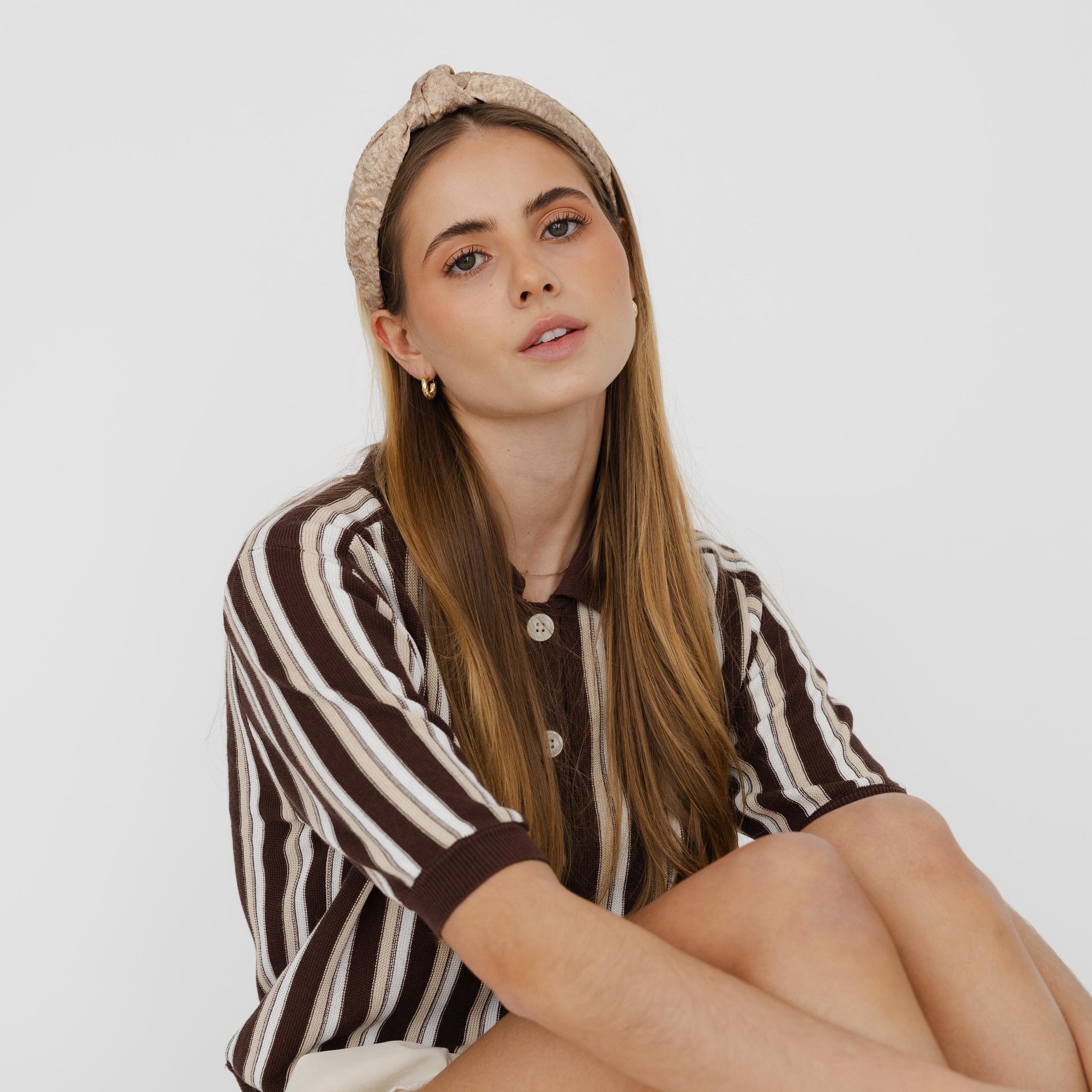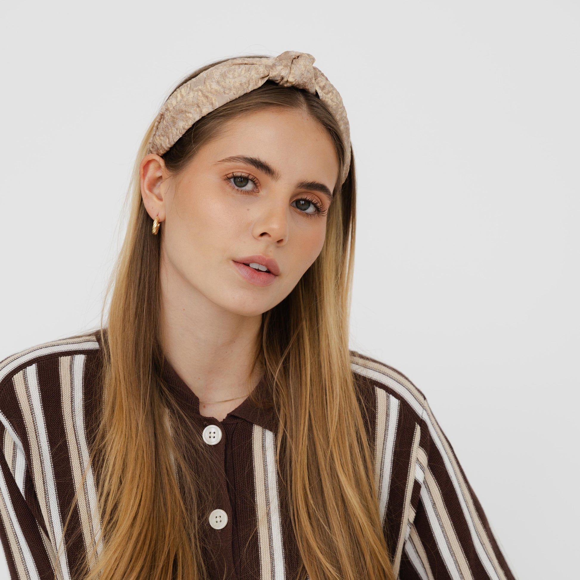 Bandolete com nó feito à mão, forrada em tecido Jacquard premium, perfeita para festas.
