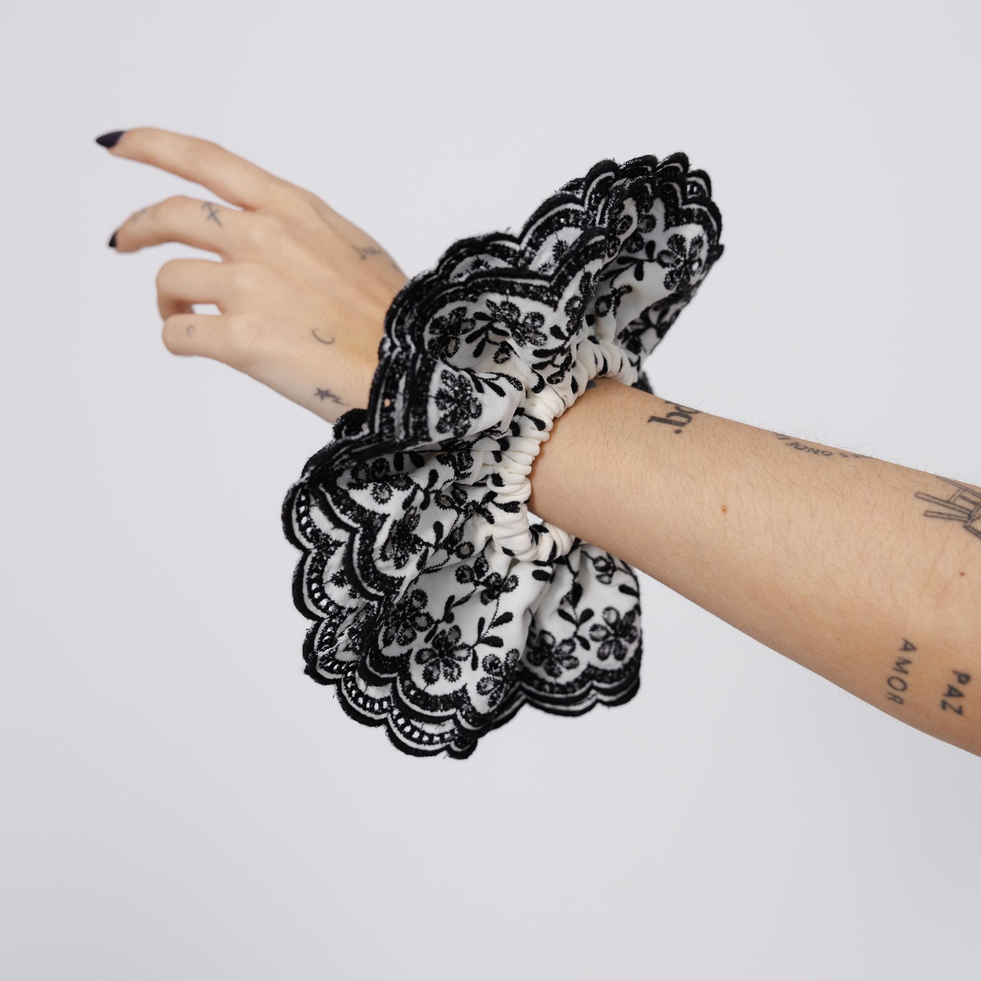 Scrunchie em camdas em bordado preto e branco.
