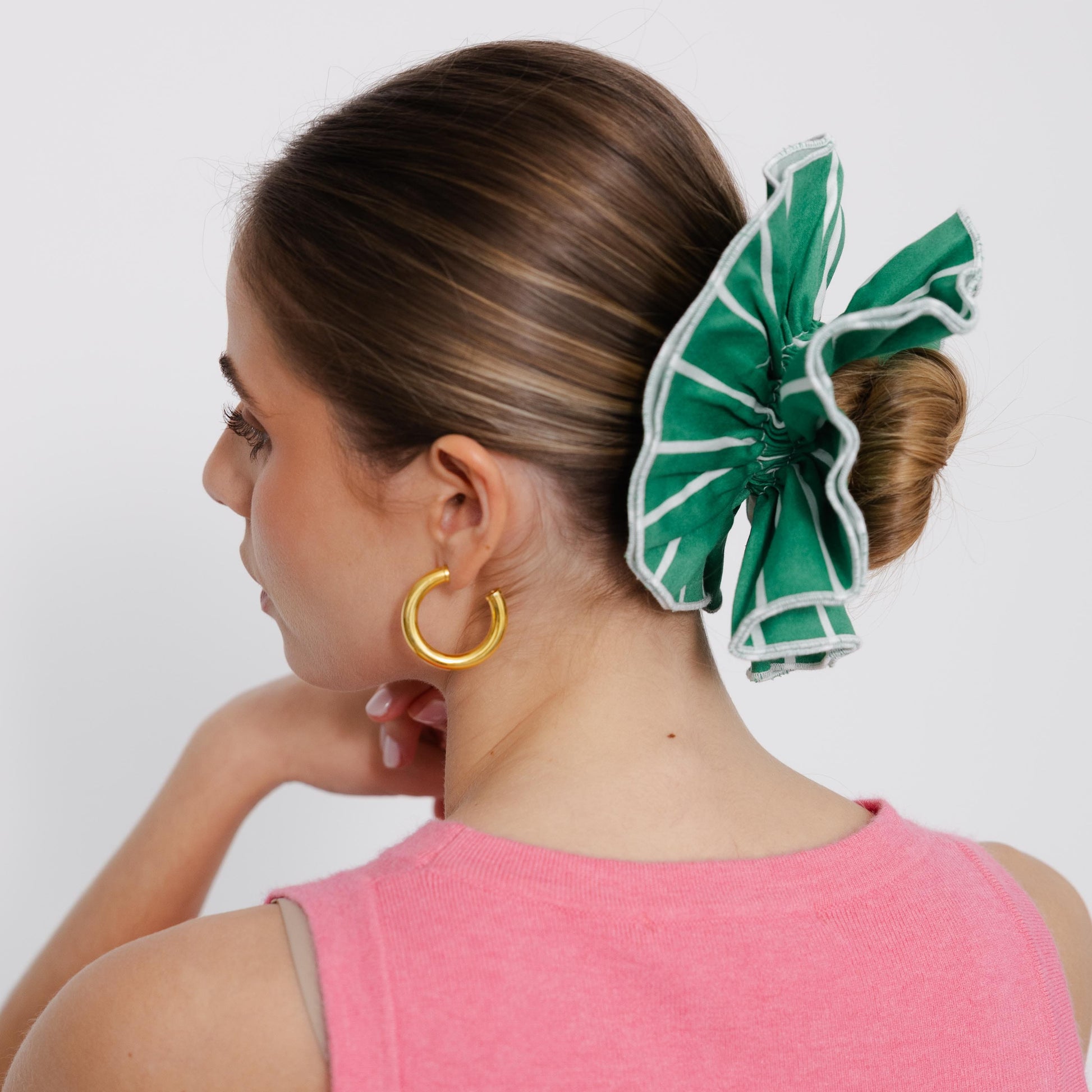 Scrunchie em camadas na cor esmeralda às riscas.